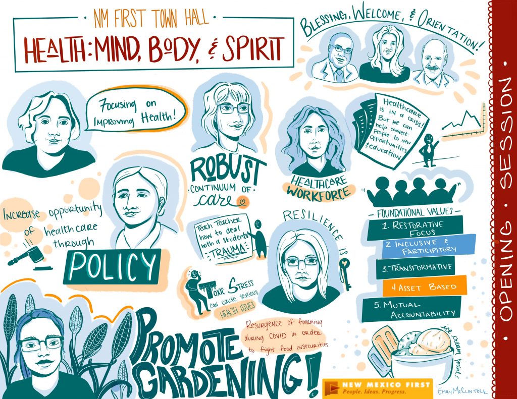 For more information on the Town Hall and the Community Conversation Summary and Highlights 2020, visit New Mexico First’s website and subscribe to their email list at http://nmfirst.org/. You will find policy background reports, town hall presentations, the community conversations final report, and the town hall final report under the “Reports” tab: http://nmfirst.org/event-details/healthcare-body-mind-and-spirit-town-hall#Reports